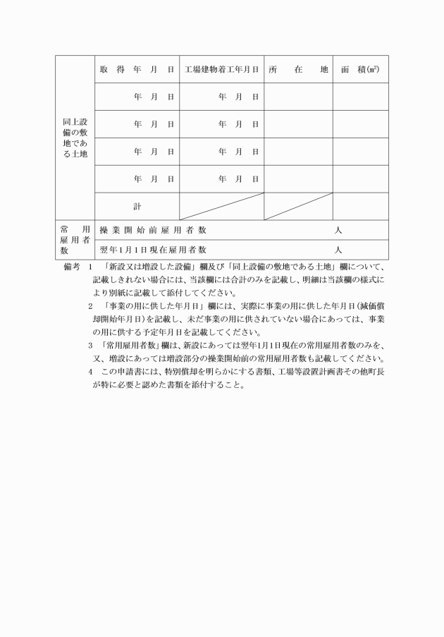 第3条 固定資産税の特別措置の適用を受けようとするものは、固定資産税の特別措置適用申請書(様式第1号)により、町長に申請しなければならない。