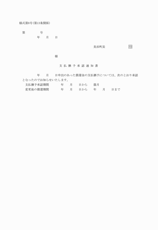 3 町長は、支払猶予を認めない旨の決定をしたときは、支払猶予不承認通知書(様式第9号)を当該借受人に交付するものとする。