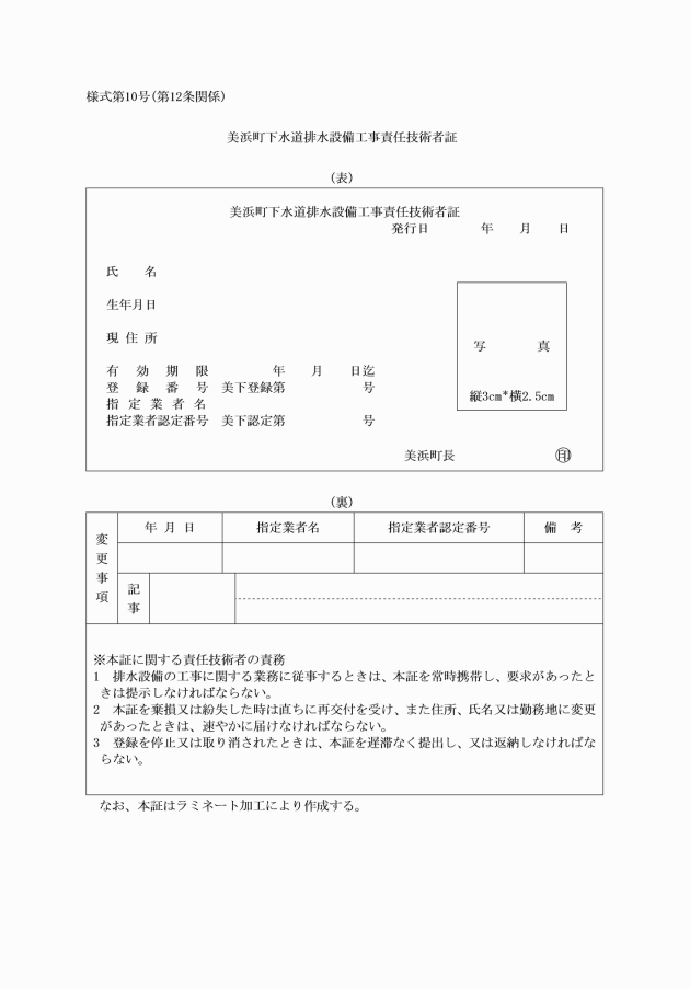 3 責任技術者は、氏名、住所又は勤務先に変更があったときは、直ちに美浜町下水道排水設備工事責任技術者変更届(様式第11号)に変更の事実を証する書類及び責任技術者証を添えて、町長に提出しなければならない。