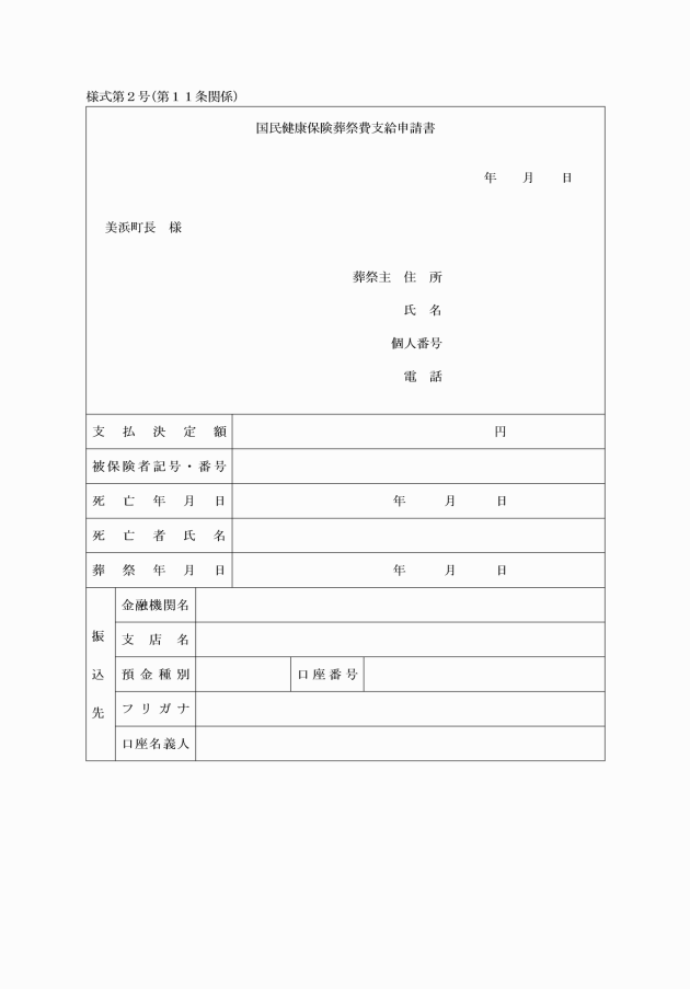 第11条 葬祭費の支給を受けようとするときは、国民健康保険葬祭費支給申請書(様式第2号)に死亡の事実を証明する書類を添付し、速やかに町長に申請しなければならない。