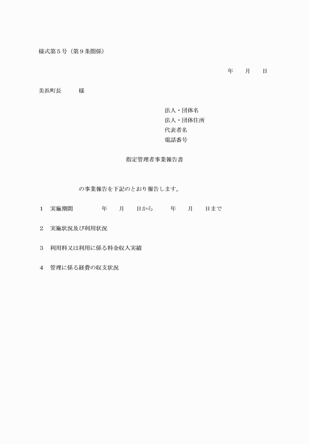 第9条 条例第9条で定める事業報告書は、指定管理者事業報告書(様式第5号)とする。