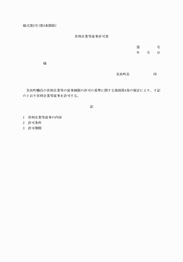 第2条 町長は、職員が法第38条第1項の規定に基づき、営利企業を営むことを目的とする会社その他の団体の役員、顧問、評議員その他これらに準ずる職を兼ね、若しくは自ら営利企業を営み、又は報酬を得て事業若しくは事務に従事することの許可の申出をしたときは、次の各号のいずれかに該当する場合を除いて、許可を与えることができる。